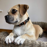 Handmade in England. Our Soft Leather Dog Collar with solid silver nickel-plated brass buckle and D-ring.