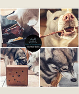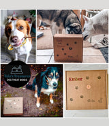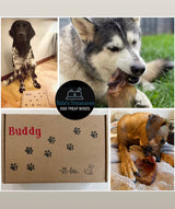Natural treats are packaged in a hand stamped and recyclable box personalised with your chosen name. All items are sustainably and responsibly sourced, high quality and grain free. No artificial flavours or colours.