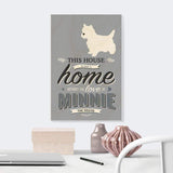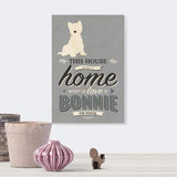 Block colour portrait of a Westie printed in grey tones on 12mm thick birch plywood for a lovely muted look. Vintage style fonts and ornaments display the words “This house is not a home without the love of ‘Name’ the Westie”.
