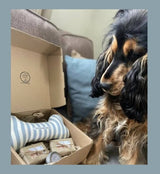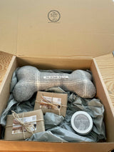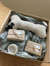 Contents: Handmade squeaky toy bone; 2 handmade Oatmeal, Lemongrass and Lavender Shampoo Bars and a 30ml Paw Balm.