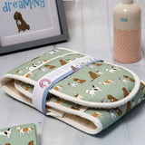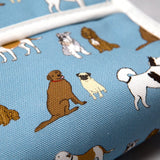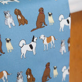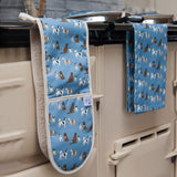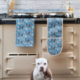 This dark blue oven glove is a mix of cotton and panama, ensuring durability and quality. It features a staffie, cocker spaniel, schnauzer, pug, husky and Labrador.