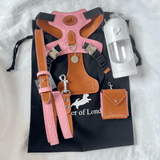 Included in the pack: 1 x Windsor Harness, 1 x Wellington Lead, 1 x Engraved ID Tag, 1 x Barking Bag and 1 x Water bottle