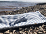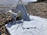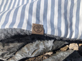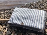 Our luxury handcrafted dog blanket is part of ‘The Teign Collection’ inspired by the beautiful Devon coast and Exe estuary. This blanket is two seasons - the high quality blue and white striped fabric for warmer days, or flip it over for cooler evenings, autumn or winter to snuggle in the cosy Sherpa sheepskin.